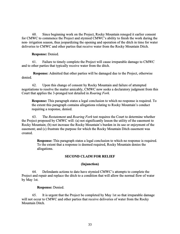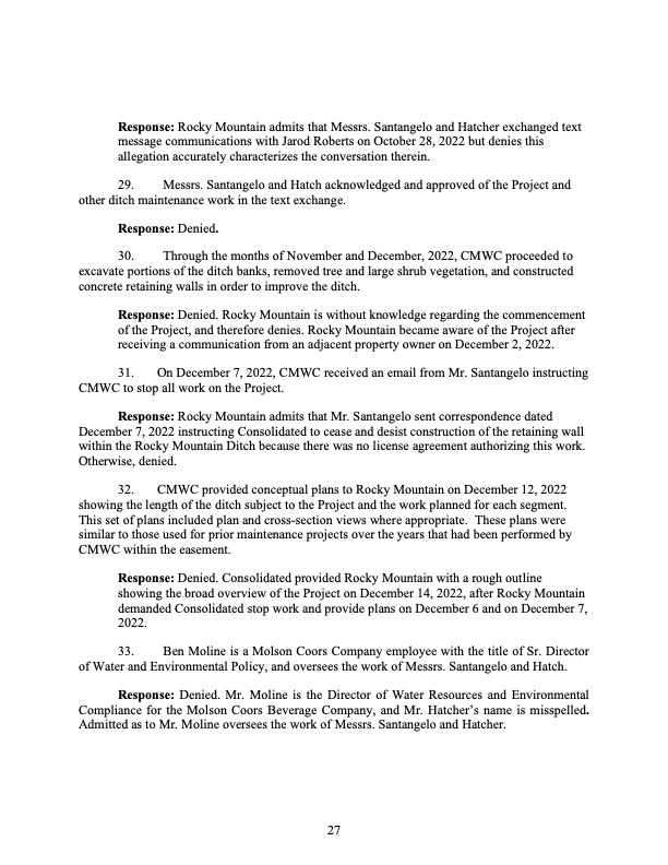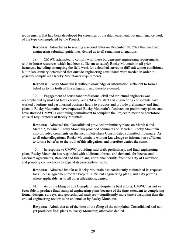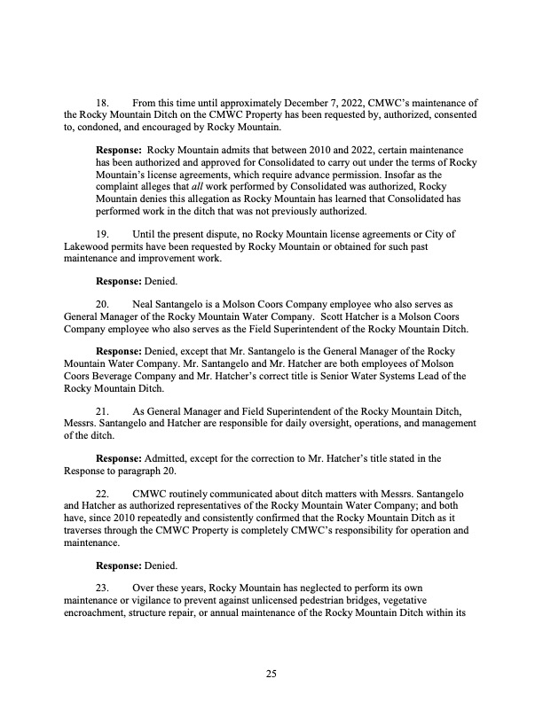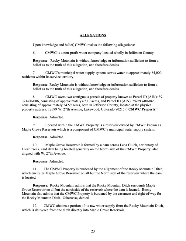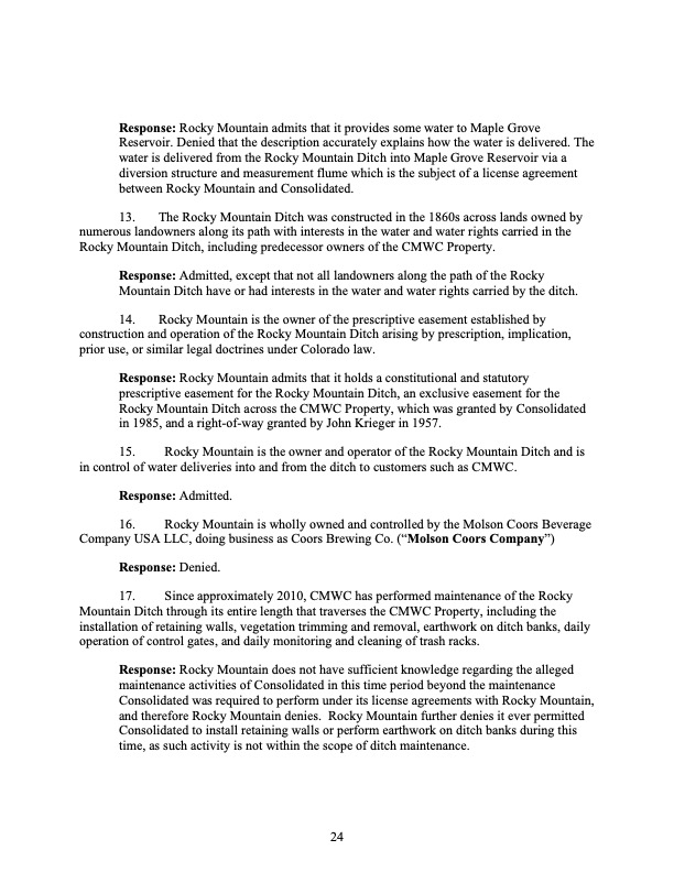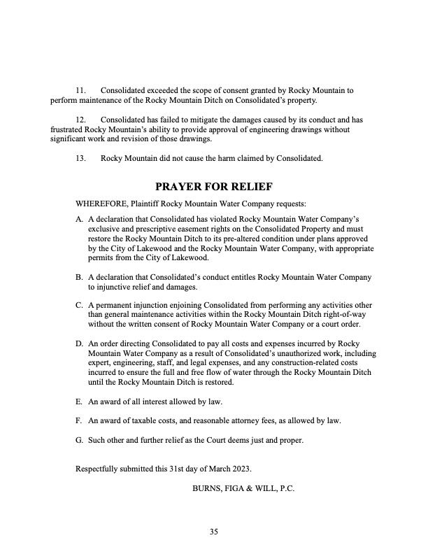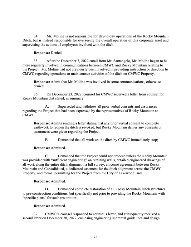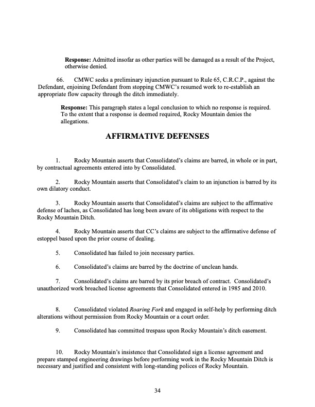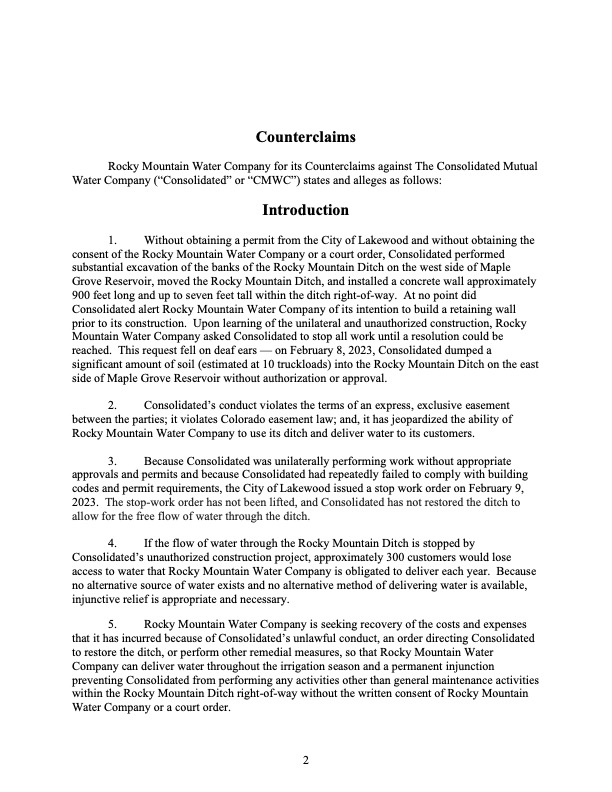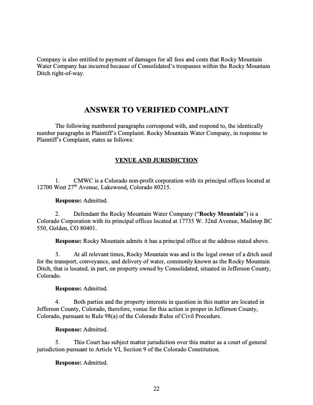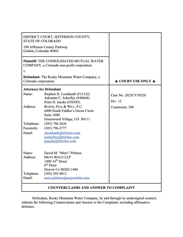 Rocky Mountain Water Company (via its counsel) submitted this 37-page Counterclaims and Answer to the Complaint that had been submitted by CMWC.