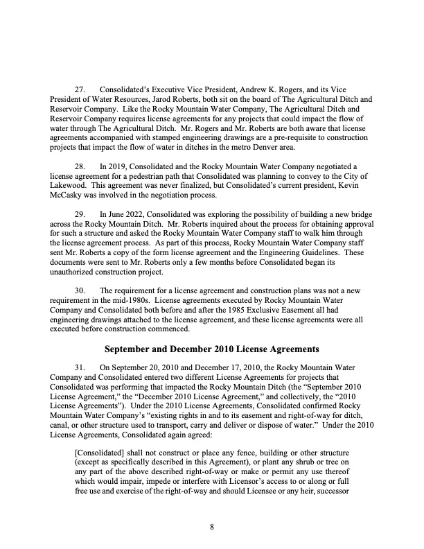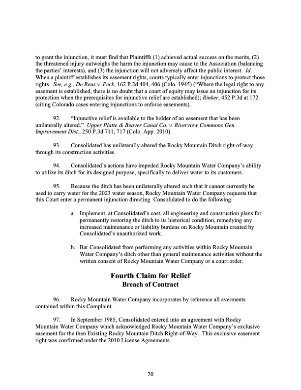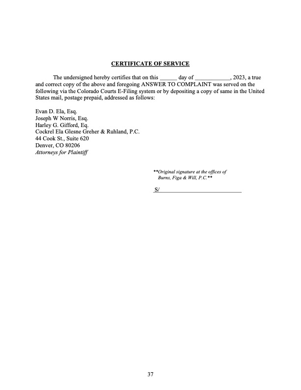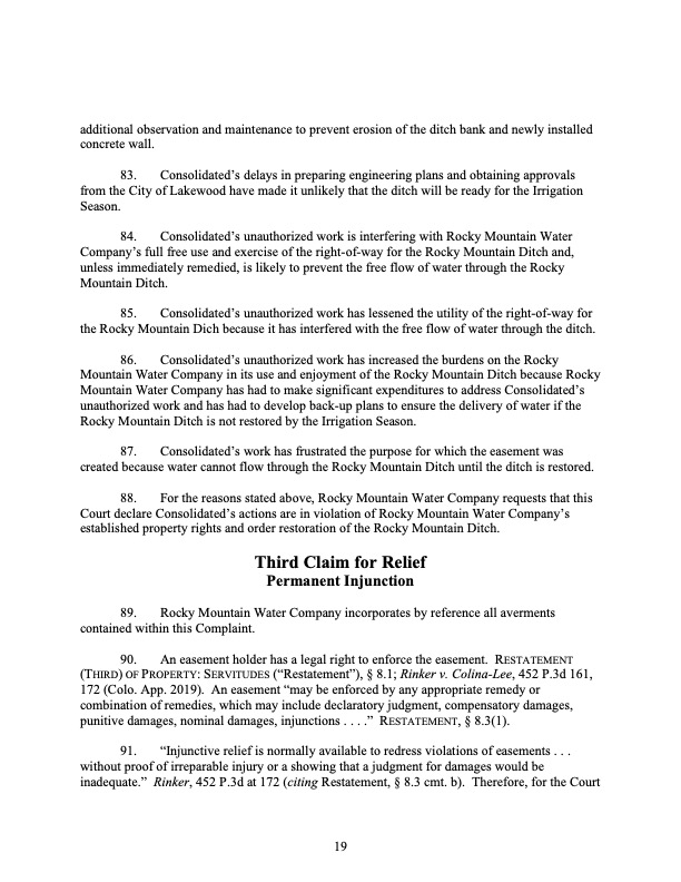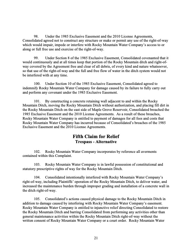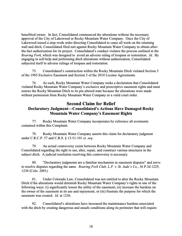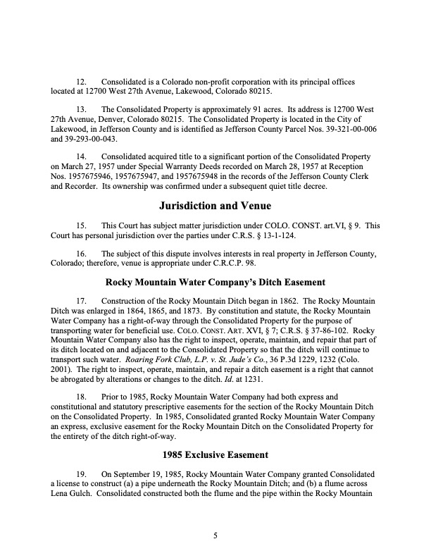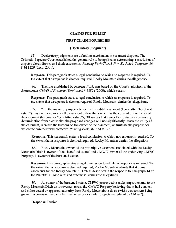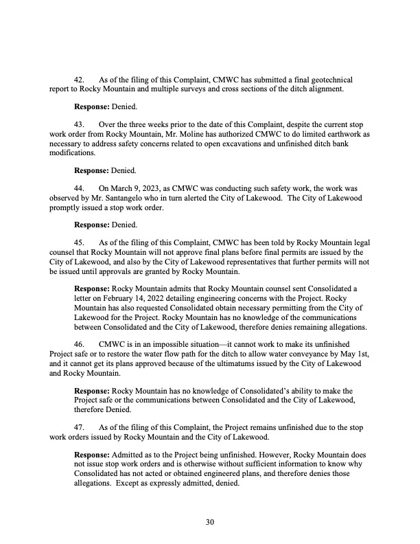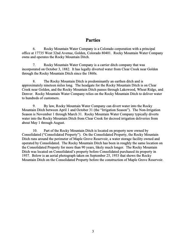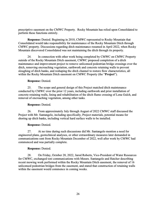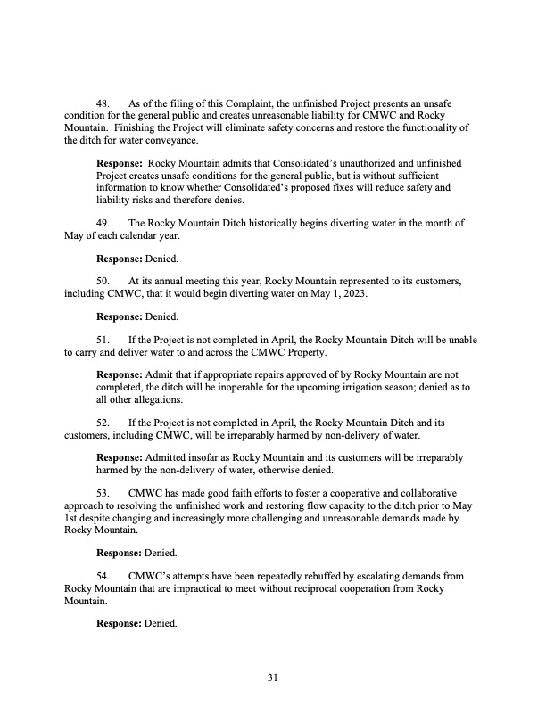 Rocky Mountain Water Company (via its counsel) submitted this 37-page Counterclaims and Answer to the Complaint that had been submitted by CMWC.