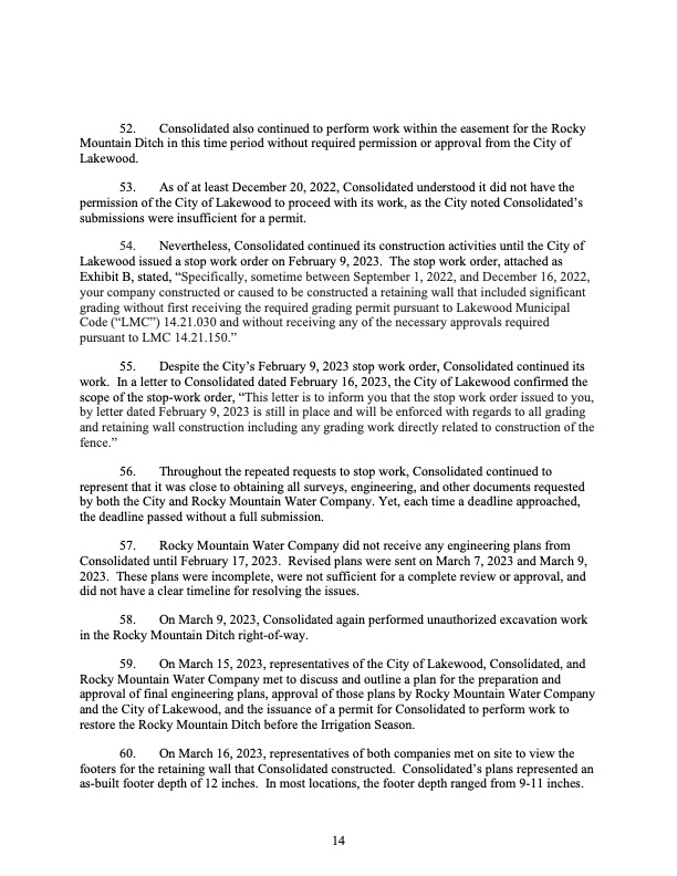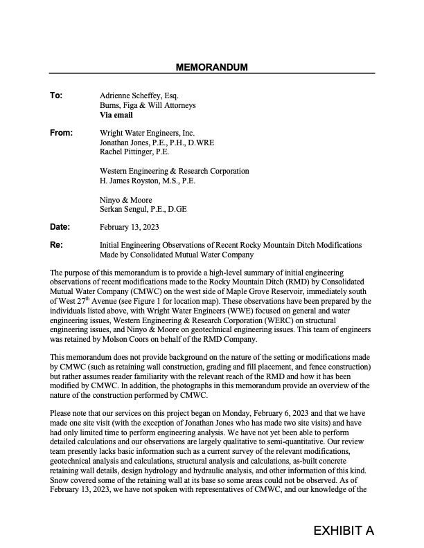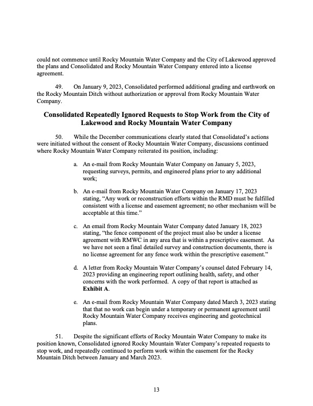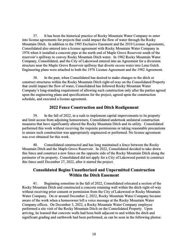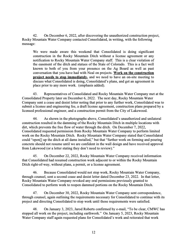December 2022 – Cease and desist enacted by Rocky Mountain Ditch Company who stated that they had no knowledge of the project and did not approve the ditch lining project.