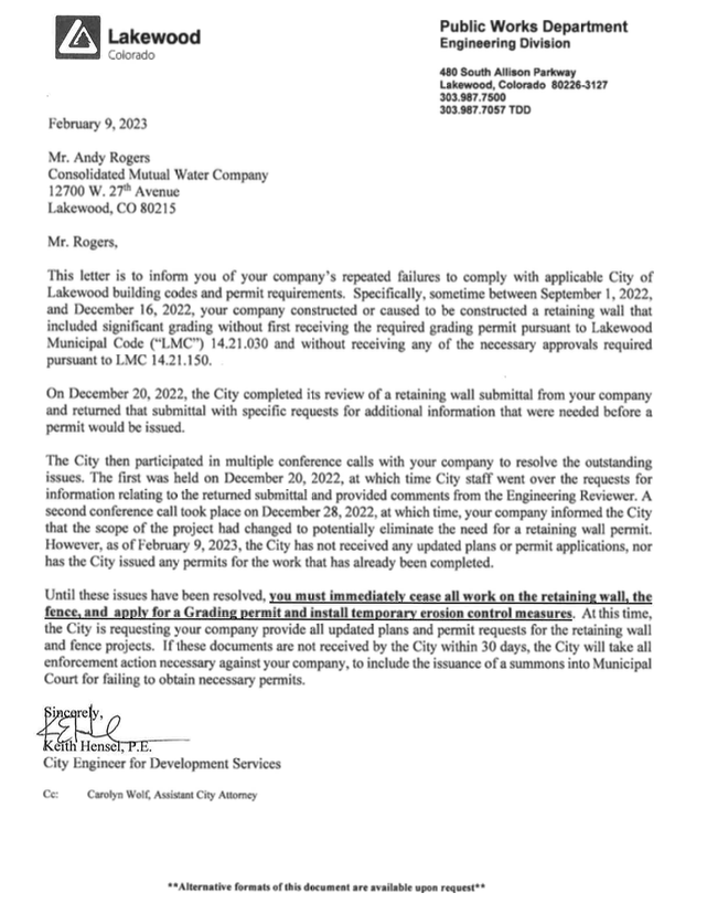 - City of Lakewood sent a letter to CMWC written by Keith Hensel. This letter is not only specific to CMWC’s 2/8/23’s infraction, but it offers a larger picture.