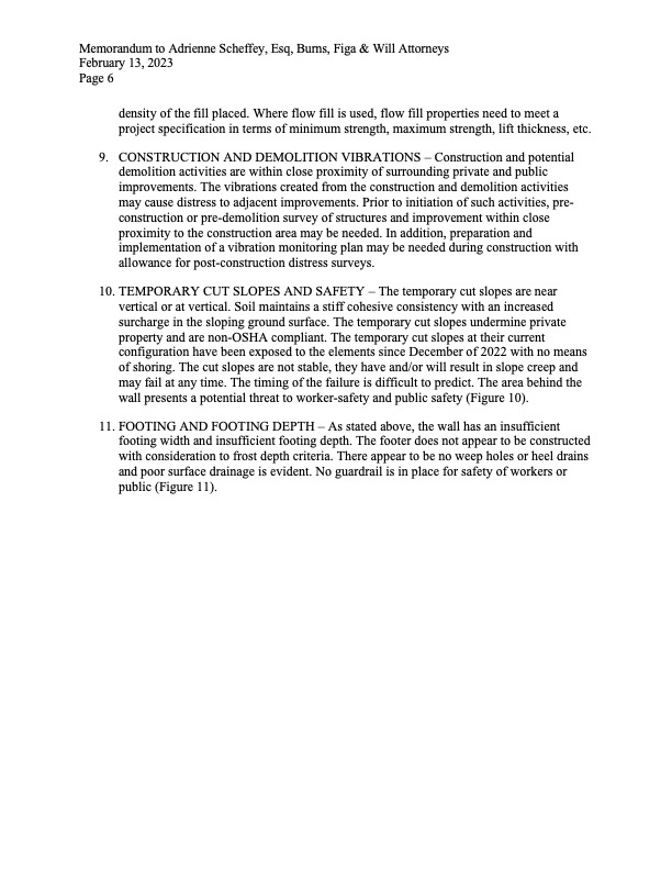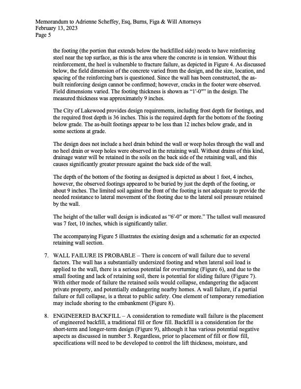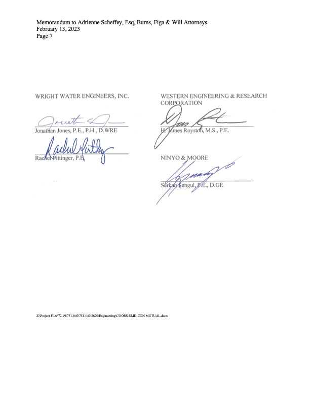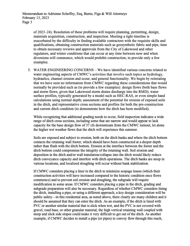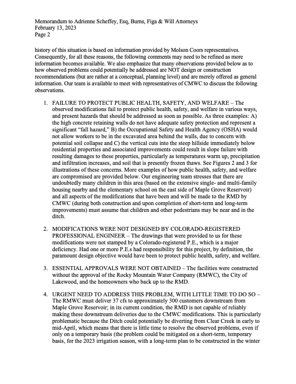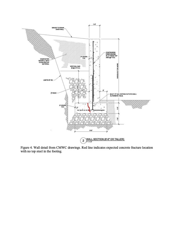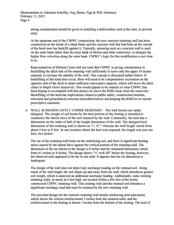 - RMWC’s engineer sent this 18-page report, which spells out the extreme ongoing safety concerns that CMWC has created by the recent construction of wall on the west side, and the associated potential impact to adjoining landowners.
